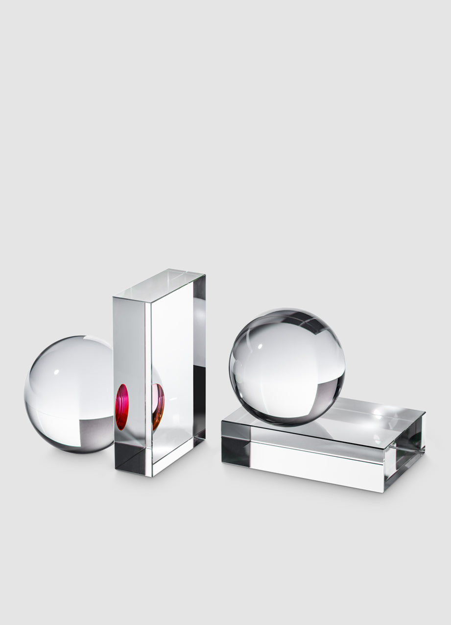 Bookends hand cut and polished in solid lead crystal for maximum brilliance and clarity. Put them on your bookshelf, on a sideboard or near a window and see how sunlight plays in the polished crystal balls. Our specially formulated pigmented bond imparts a gentle touch of color to the piece, creating a captivating visual experience.