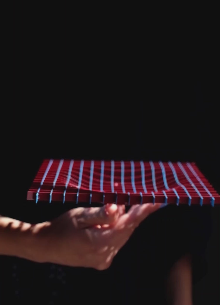 Inspired by sci-fi fantasies of bending the space-time continuum, we made this red and blue, warped grid tray responding to a hidden force. The colour changes depending on which angle you look at the tray from. The pieces are ingeniously locked into place providing some flexibility, so you can play with the exact angle of the grid.