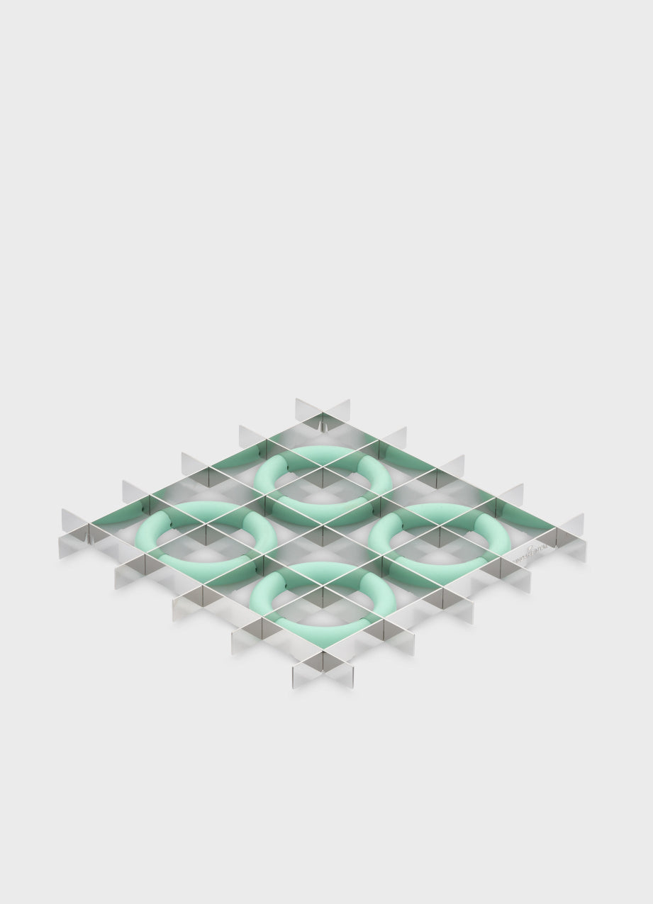 Elevate your hosting game with this playful heat resistant pad. A geometric play of colour, form and texture, it contrasts the rigid, glossy grid with the soft, colourful round shapes. Made in Germany. Stainless Steel and Silicone. Dishwasher Safe.
