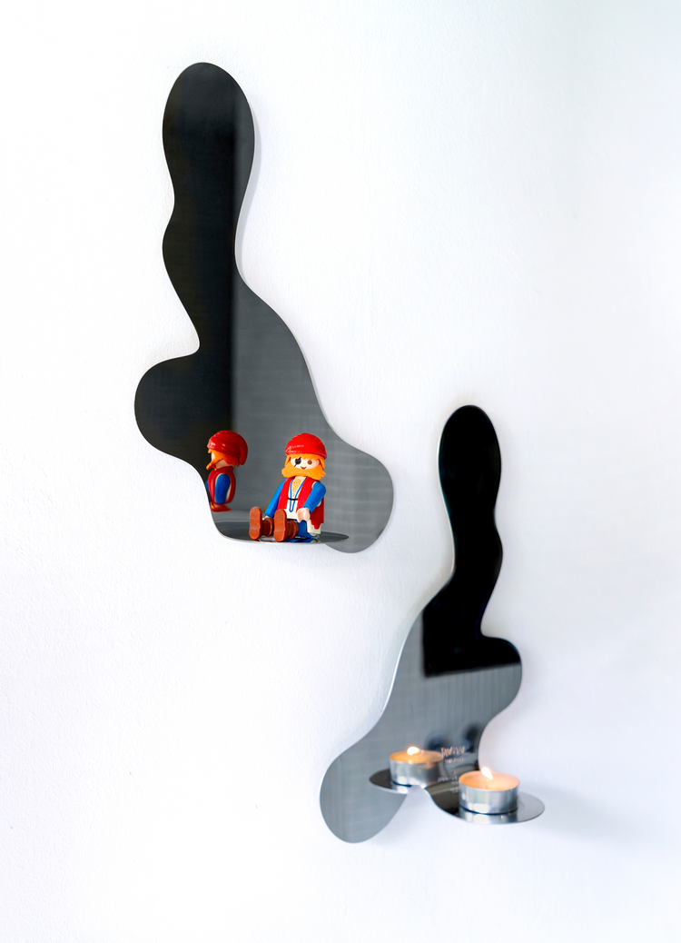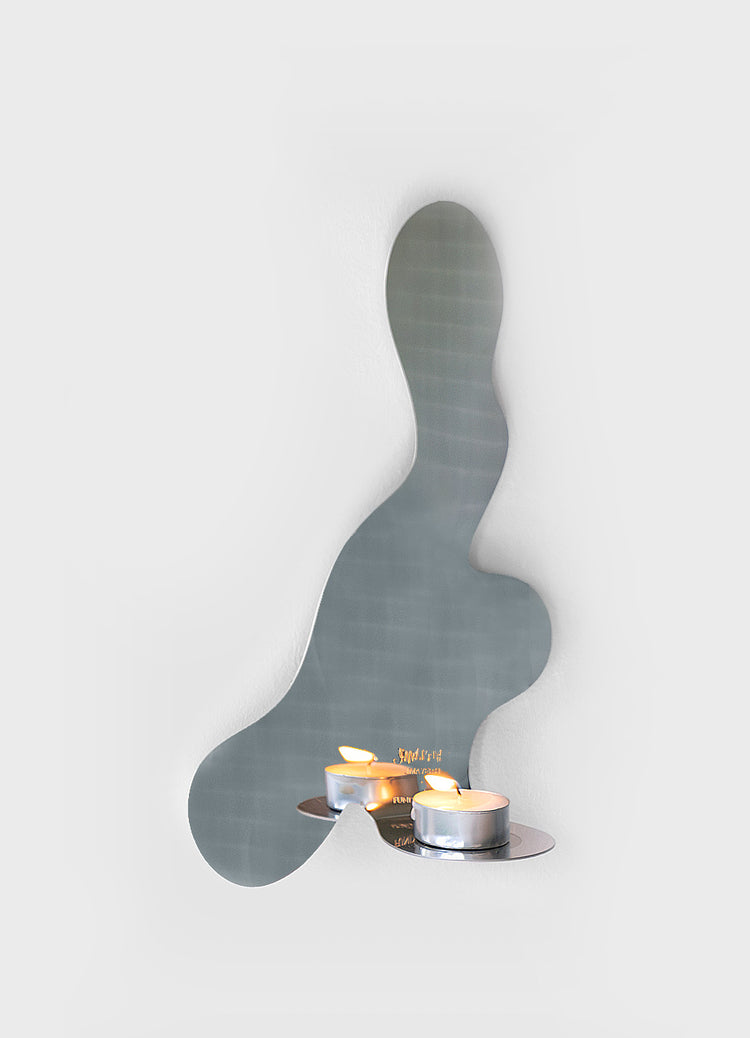 Liquid Wall Tealight - a polished steel wall piece that holds a single tealight, reflecting flame and space in flowing contours. Available in left and right orientations.