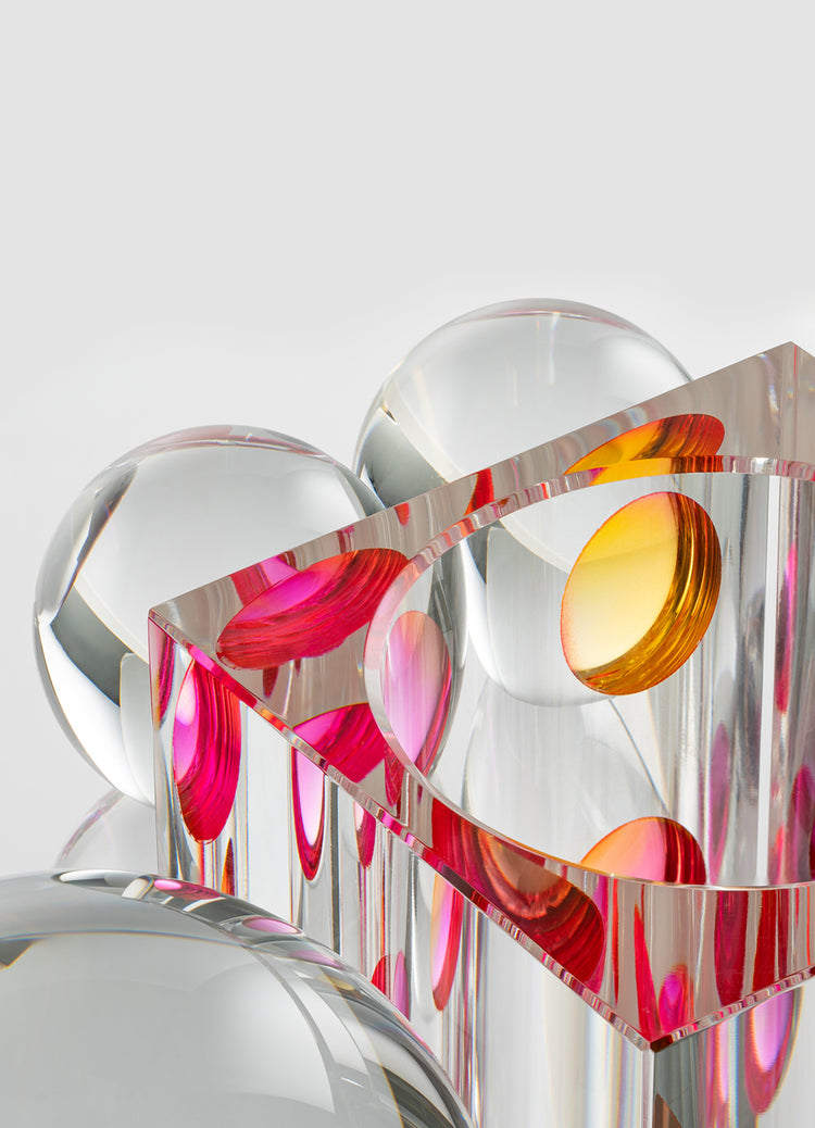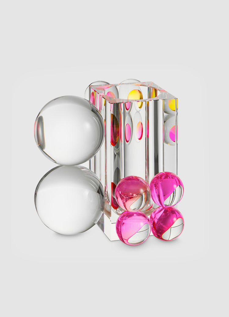 A strong sculptural gesture, this vase will make the ultimate statement in a room. The main body of the piece is carved from a single monolithic block of heavy crystal, ground and polished over many days by skilled artisans to give it that showstopping lustre that only hand cut crystal has. Once the sides are exceptionally flat and exceptionally straight, the 10 solid crystal balls are bonded to the surface using our proprietary pigmented bond. The bonding layer itself is less than 8 µm thin, and contains very pure yellow and magenta pigments that are allowed to begin to fuse into each other. As you move around the piece, you will see that from some angles, the crystal balls are filled with a rush of colour, while from others the piece is perfectly clear and still, giving the piece its own version of the Mona Lisa smile.